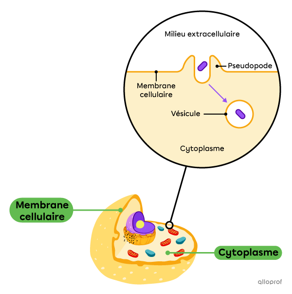 La phagocytose est un sous type de l’endocytose ou la cellule vas s’étendre vers une bacterie ou autre phage pour ensuite l’atraper dans un Vésicule pour le neutraliser. Les protruisions ansi former sur la cellule sont nommer peudopodes.