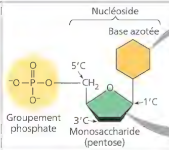 Les nuclétide sont composer d’une groupement phosphate et d’un monosaccharide et d’une base azoter. Les base asoter defenissent la lettre. soit C, T, A et G. Dans l’ARN le T est remplacer par le U